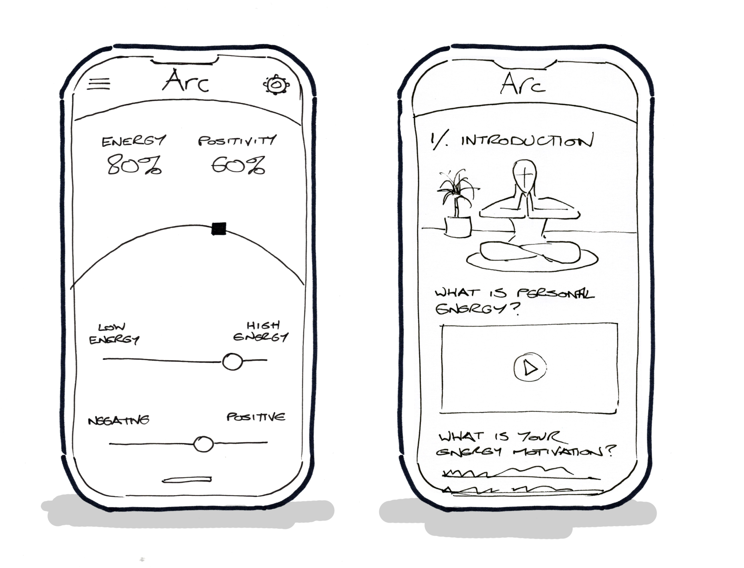 This concept relied on the simplicity of an arc as the core visual of the piece. The energy slider would increase the amplitude of the arc, and the positivity slider would move it from left to right with an accompanying change in the colour to help illustrate the user’s mood.