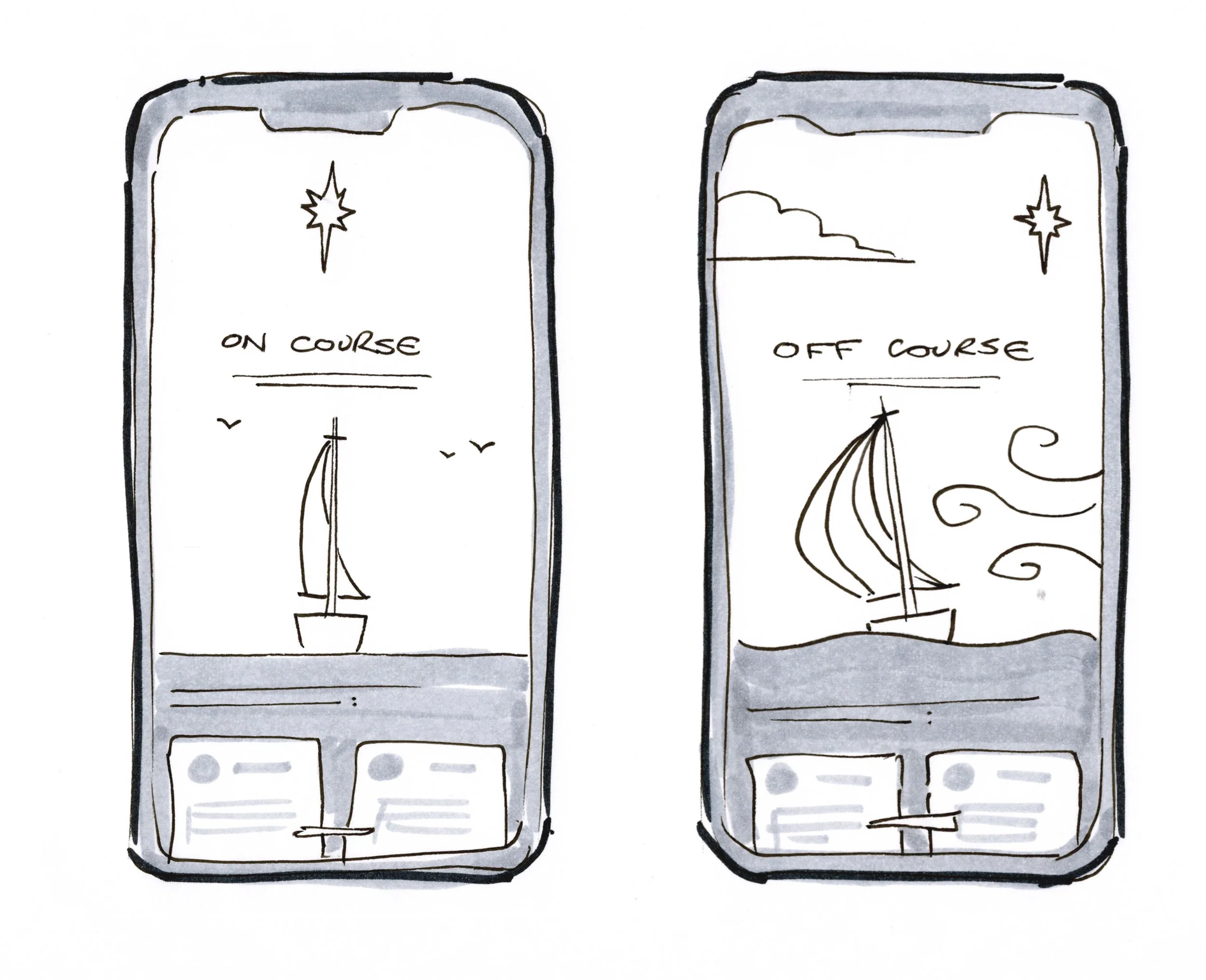 The user would input on the first screen how on-course or off-course they felt and that would have a real-time effect on the scene shown in the animated illustration. Inputting as on-course would show a calm sea, a stable boat and the northstar in the centre of the sky. Moving the slider into the off course area would move the “northstar'“ off to the side, with the weather and sea conditions becoming worse.